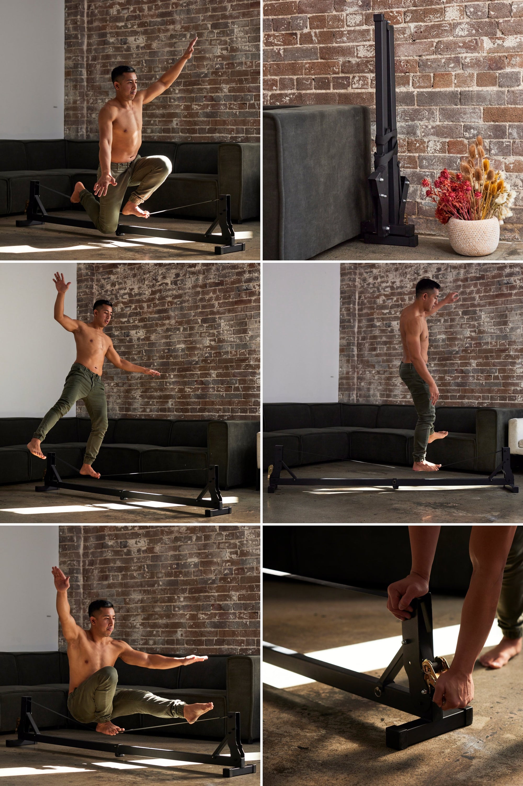 Configuración simple: despliega la base y ajusta la tensión de tu slackline. Camina, gira, haz lunges y sentadillas en tu sala de estar.
