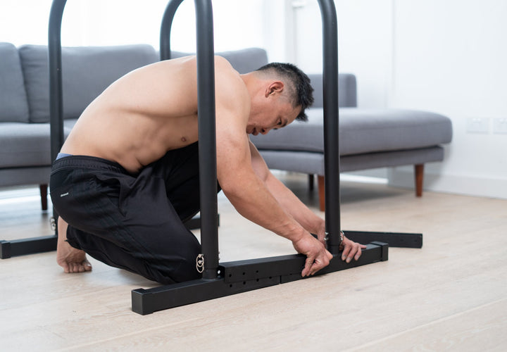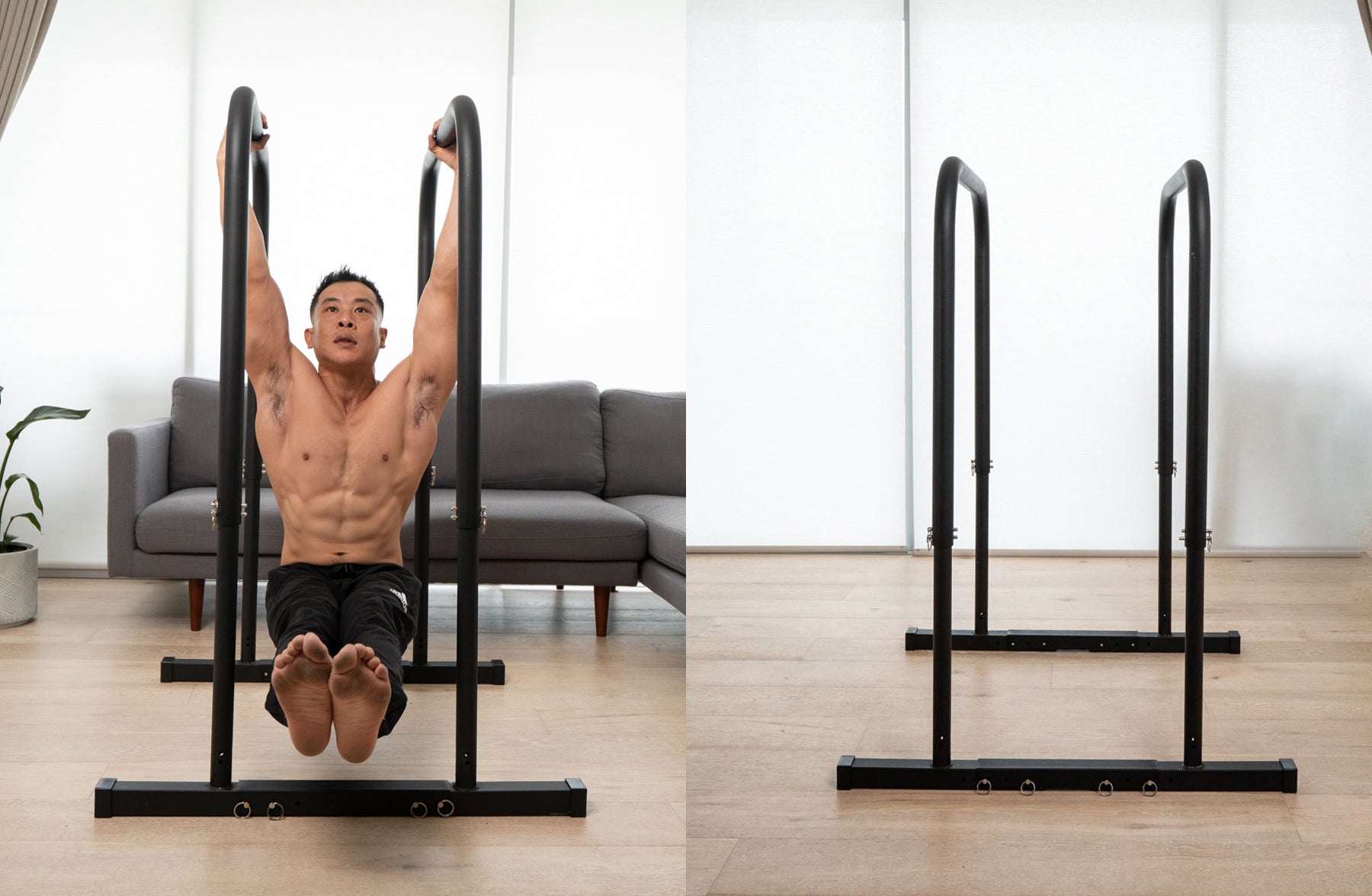 Meet the B-Bars, our parallel bars designed for your living room. Build strength in your upper body and core with bodyweight exercises. Perform pressing and horizontal pulling exercises (rows, dips) at the 91cm height and vertical pulling (pull-ups/chin-ups) on the 129cm height. Easy setup and freestanding – quick release clickpins for a speedy setup (no screws or bolts and no attachments to external fixtures.