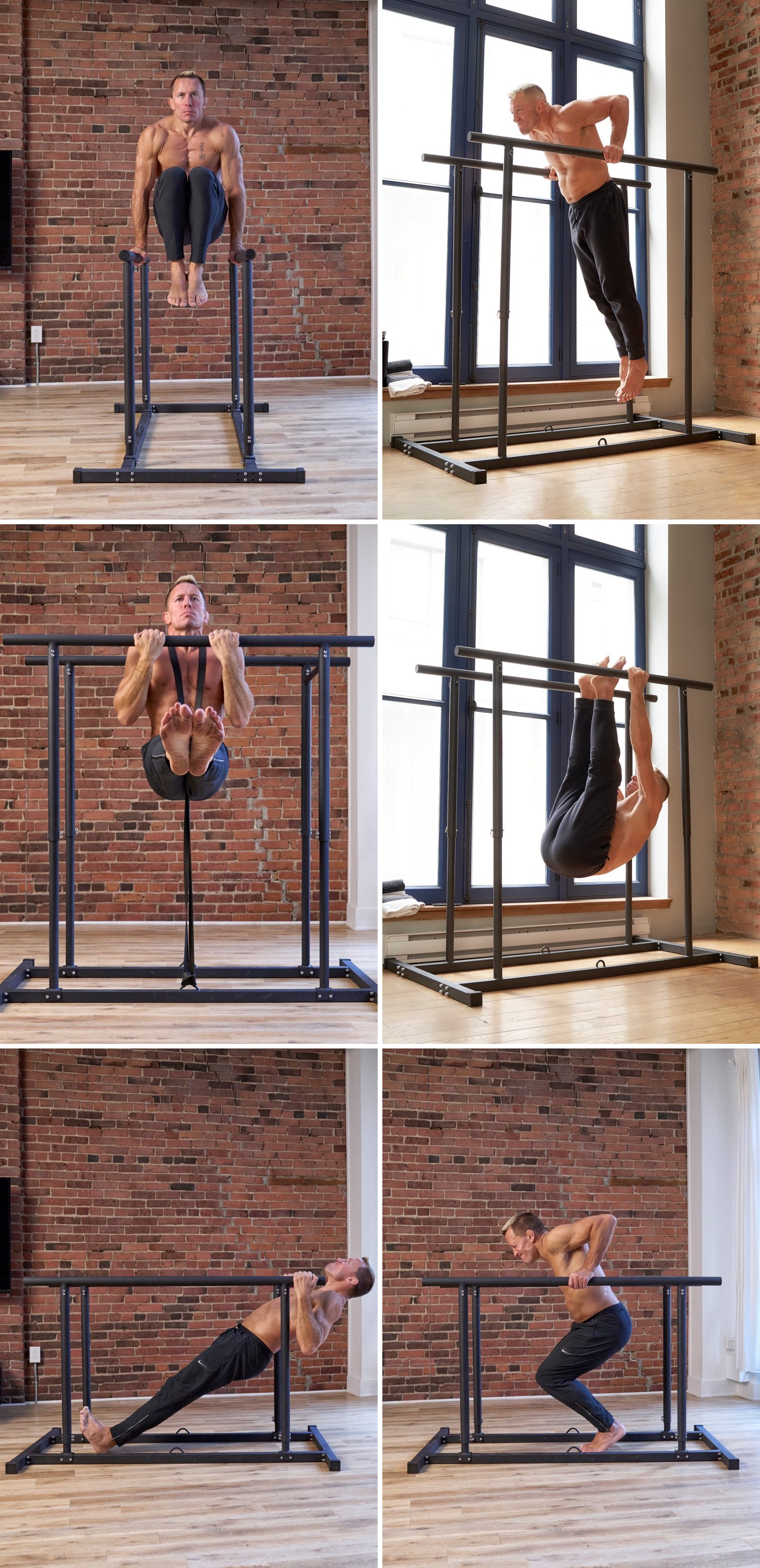 Built for explosive/swinging exercises. Assembled at three heights (20cm, 95cm and 150cm). Perform parallettes, parallel bars and high bar exercises. Requires a bit more floor space (160 x 94cm ) and is not designed to be stored after use.