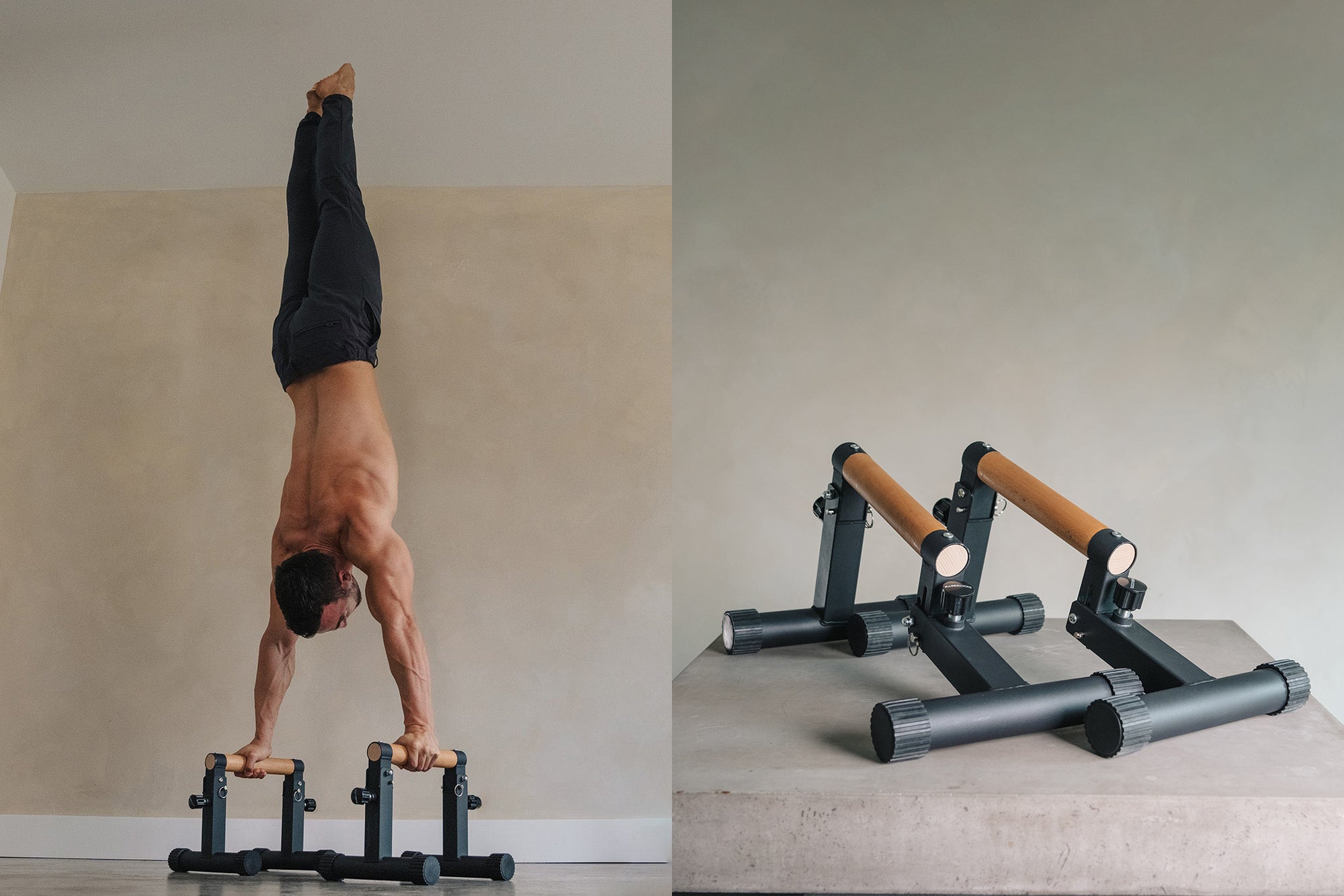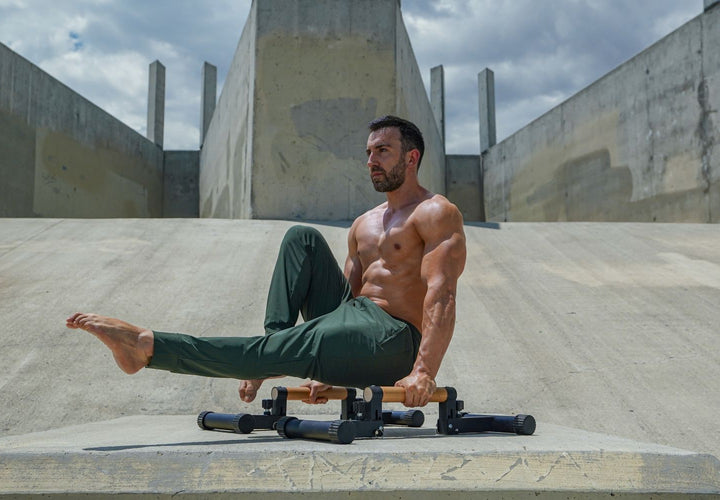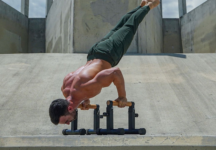 Nutze die hohen Parallettes, um bei Übungen wie HSPUs einen größeren Bewegungsumfang zu erhalten, und die niedrigen Parallettes, um bei statischen Übungen strenge Form zu wahren.