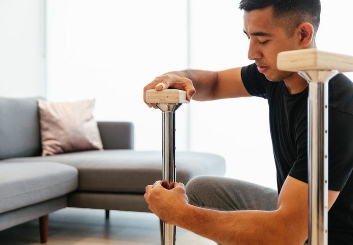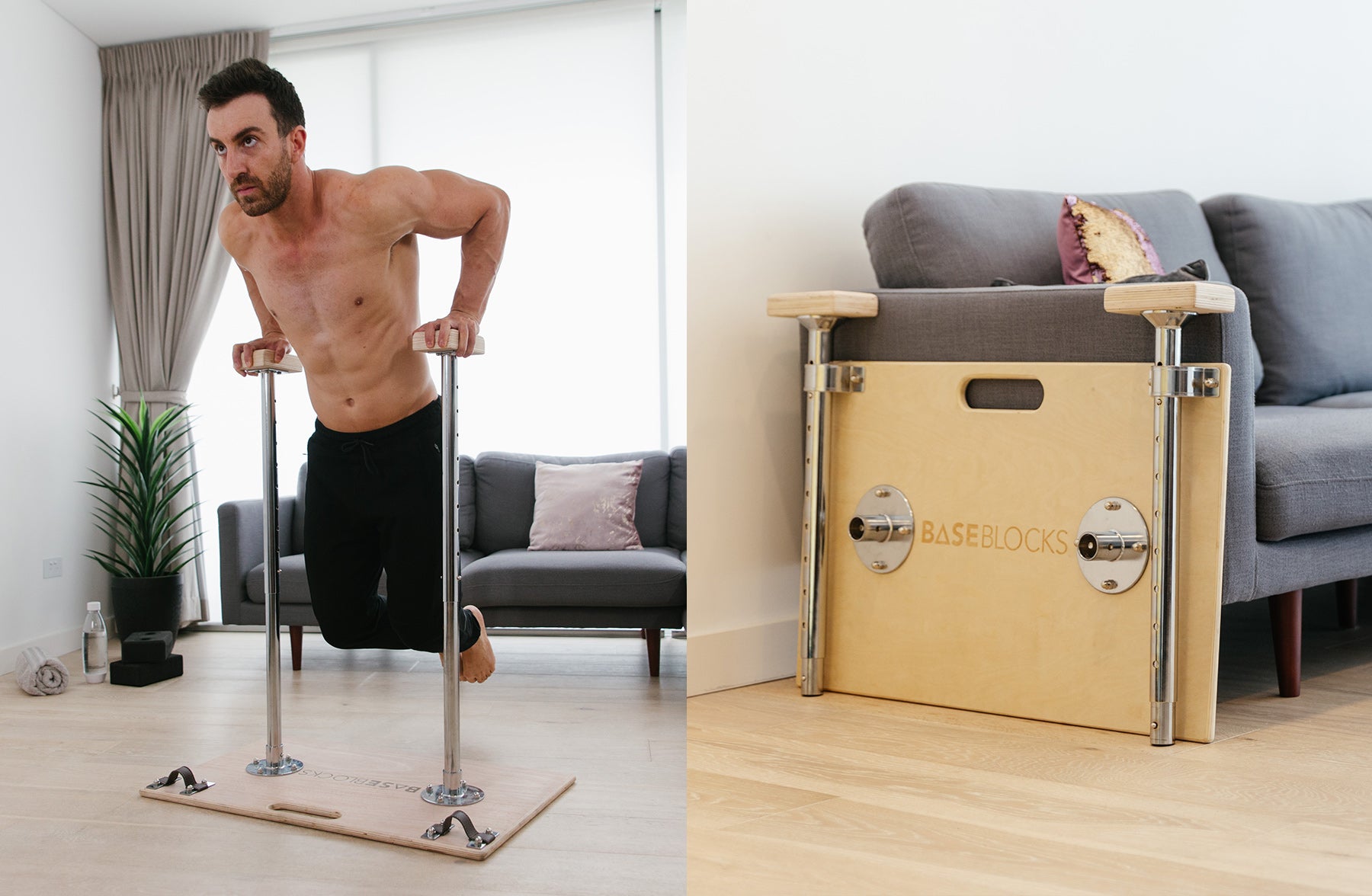 Meet the BaseBlocks Trainer. Inspired by handstand canes, the BaseBlocks Trainer allows users to perform pushing, pulling, core and leg exercises using only their bodyweight. The uprights are height-adjustable and have multi-directional instability to replicate the instability of gymnastics rings, challenging your stabilizers with every exercise. Perform exercises like step-ups and push-ups at the lowest height, and rows and dips at the tallest height. Slides under your bed or sofa for storage and assembled in seconds.